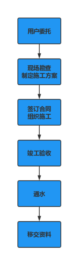 二、用戶委托---建設(shè)工程有限公司現(xiàn)場踏勘---供水施工方案---簽訂合同---建設(shè)工程有限公司組織安全文明施工---竣工第三方驗收---通水---移交(供水設(shè)施及技術(shù)檔案)